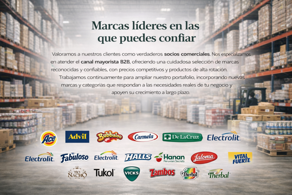 Valoramos a nuestros clientes como verdaderos socios comerciales. Nos especializamos en atender el canal mayorista B2B, ofreciendo una cuidadosa selección de marcas reconocidas y confiables, con precios competitivos y productos de alta rotación. Trabajamos continuamente para ampliar nuestro portafolio, incorporando nuevas marcas y categorías que respondan a las necesidades reales de tu negocio y apoyen su crecimiento a largo plazo.
